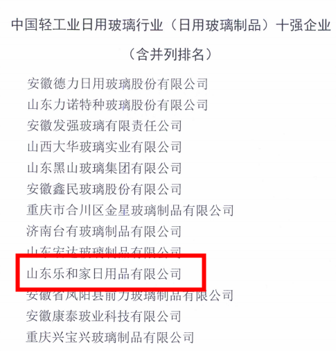 不忘初心 ,砥砺前行。在不久前结束的中国轻工业联合会组织开展的2022年度 “ 中国轻工业行业十强企业 ” 统计评价工作中 ,山东乐和家日用品有限公司荣获中国轻工业日用玻璃行业 (日用玻璃制品) 十强企业 。